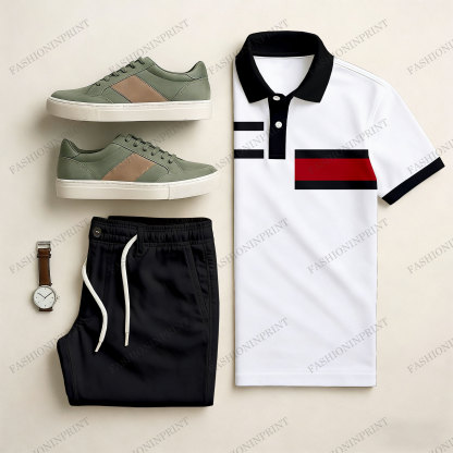 Men's Casual Black & White Color Matching Geometric Printed Short Sleeved Polo Shirt & Trousers Two-Piece Set