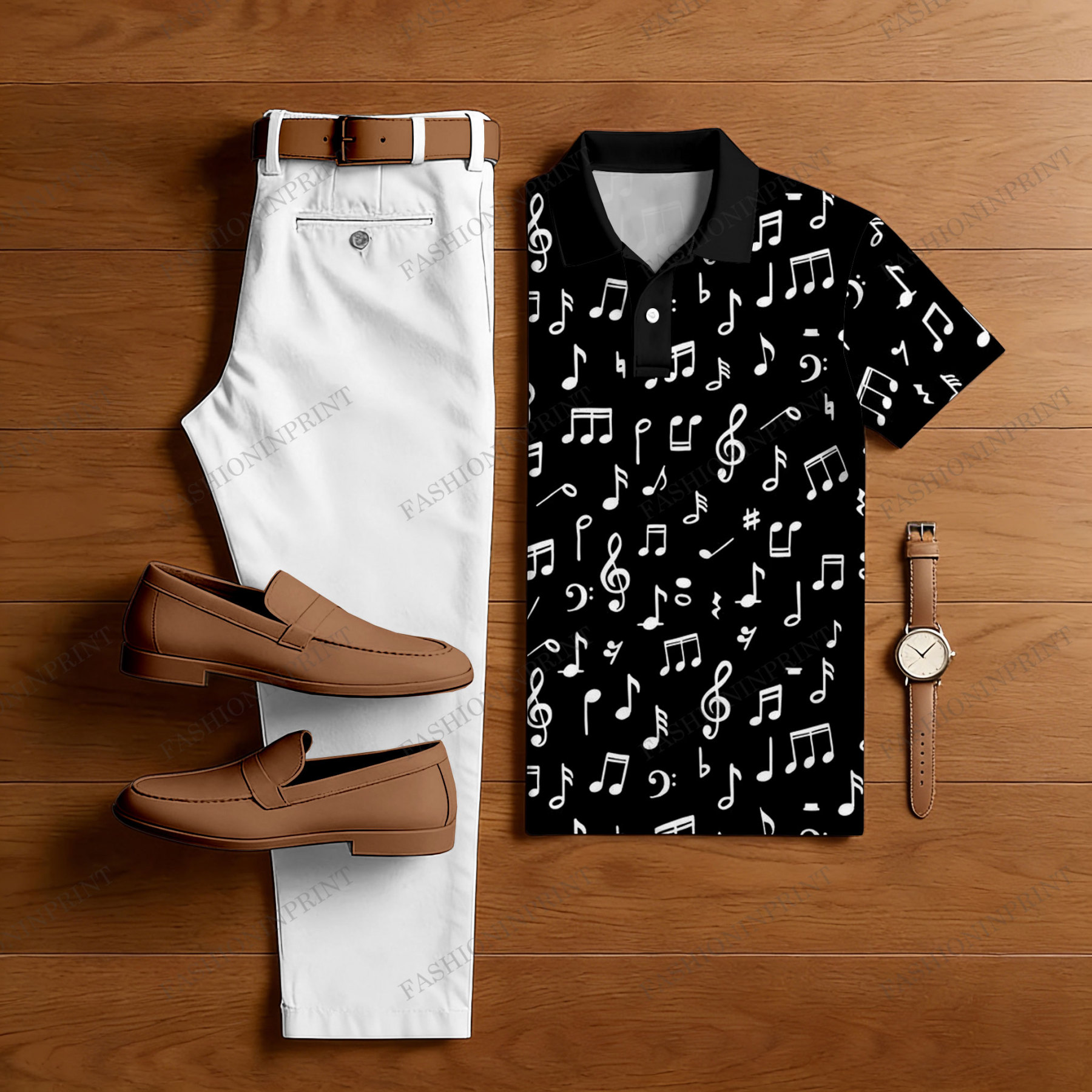 Men's Casual Black & White Color Matching Music Art Printed Short Sleeved Polo Shirt & Trousers Two-Piece Set