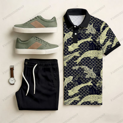 Men's Casual Black & Yellow Color Matching Ethnic Style Printed Short Sleeved Polo Shirt & Trousers Two-Piece Set