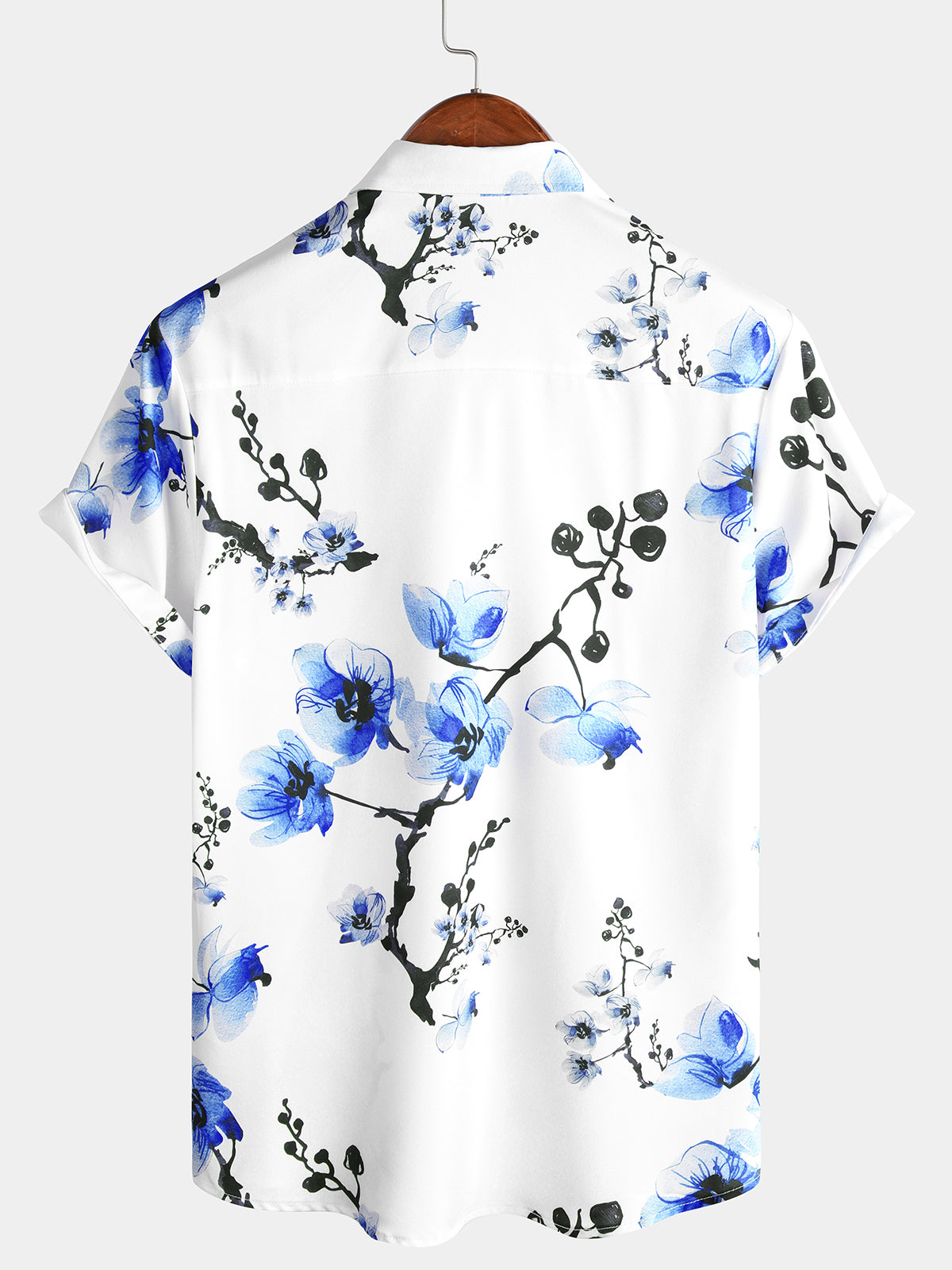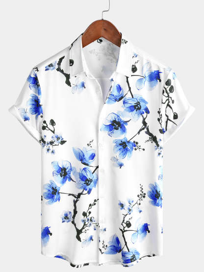 Men's Casual Blue Floral Print Summer Button Up Flower Short Sleeve Cherry Blossom Shirt