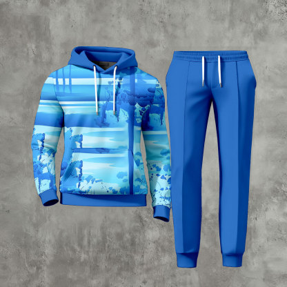 Men's Casual Blue Ink Painting Long-Sleeve Hoodies Sweatshirt & Trousers Two-Piece Set