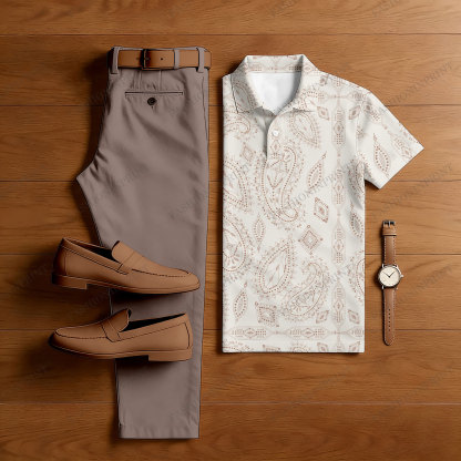 Men's Casual Brown & White Color Matching Art Printed Short Sleeved Polo Shirt & Trousers Two-Piece Set
