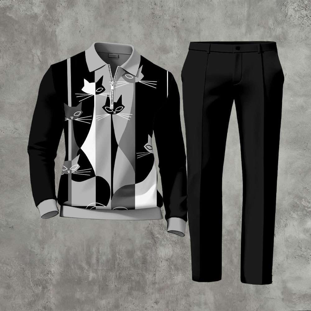 Men's Casual Cats Color Matching Printed Black & Gray Polo-Collar Zipper Long-Sleeve Trousers Two-Piece Set