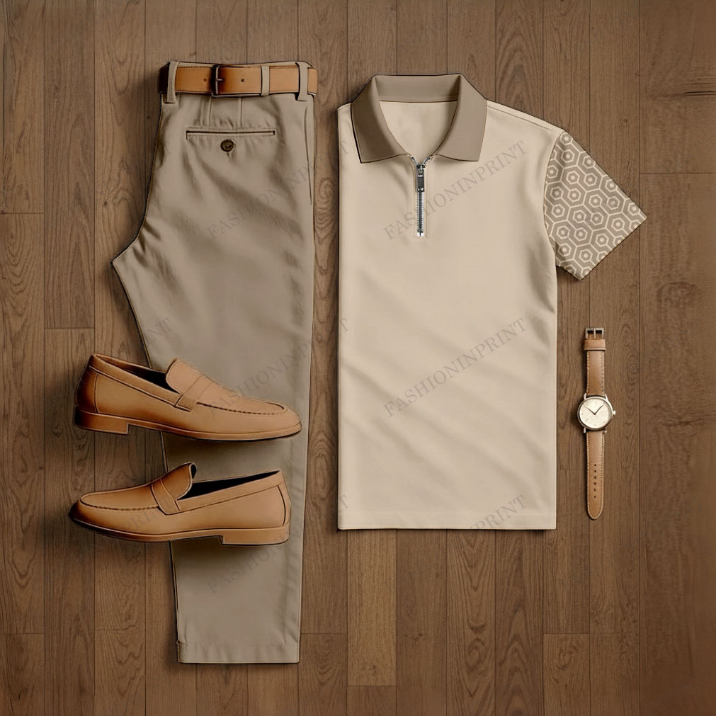 Men's Casual Coffee & Apricot Color Matching Geometric Printed Short Sleeved Polo Shirt & Trousers Two-Piece Set