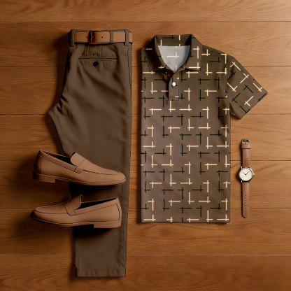 Men's Casual Coffee Color Matching Printed Short-Sleeve Polo Shirt & Trousers Two-Piece Set