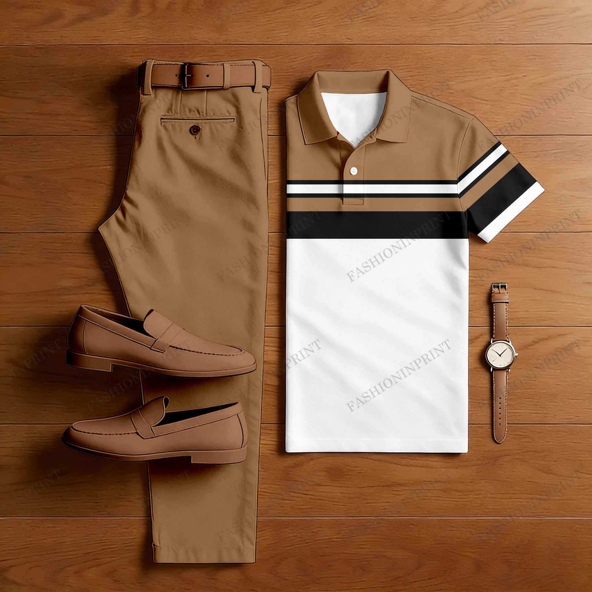 Men's Casual Color Blocking Geometric Printed Short Sleeved Polo Shirt & Trousers Two-Piece Set
