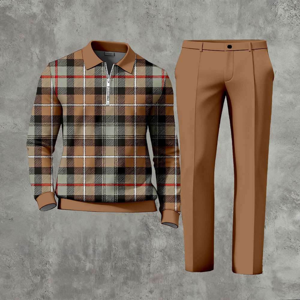 Men's Casual Color Matching Coffee Checked Printed Polo-Collar Zipper Long-Sleeve Trousers Two-Piece Set