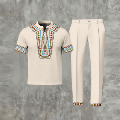 Men's Casual Color Matching Ethnic Pattern Round Neck Zipper Short Sleeved T-Shirt & Trousers Beige Two-Piece Set