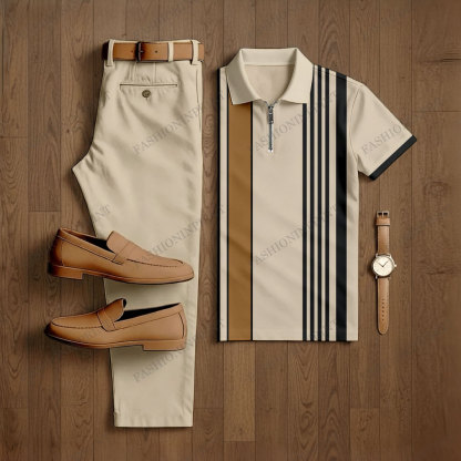 Men's Casual Apricot Color Matching Striped Printed Short Sleeved Polo Shirt & Trousers Two-Piece Set