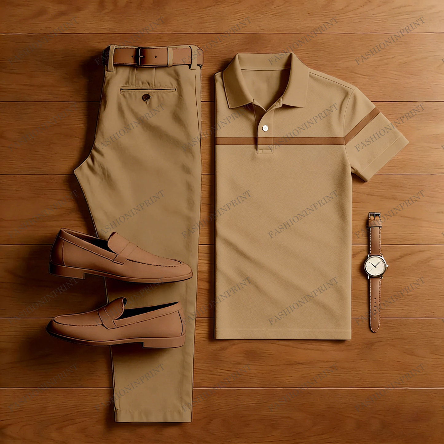 Men's Casual Tan Striped Printed Short Sleeved Polo Shirt & Trousers Two-Piece Set