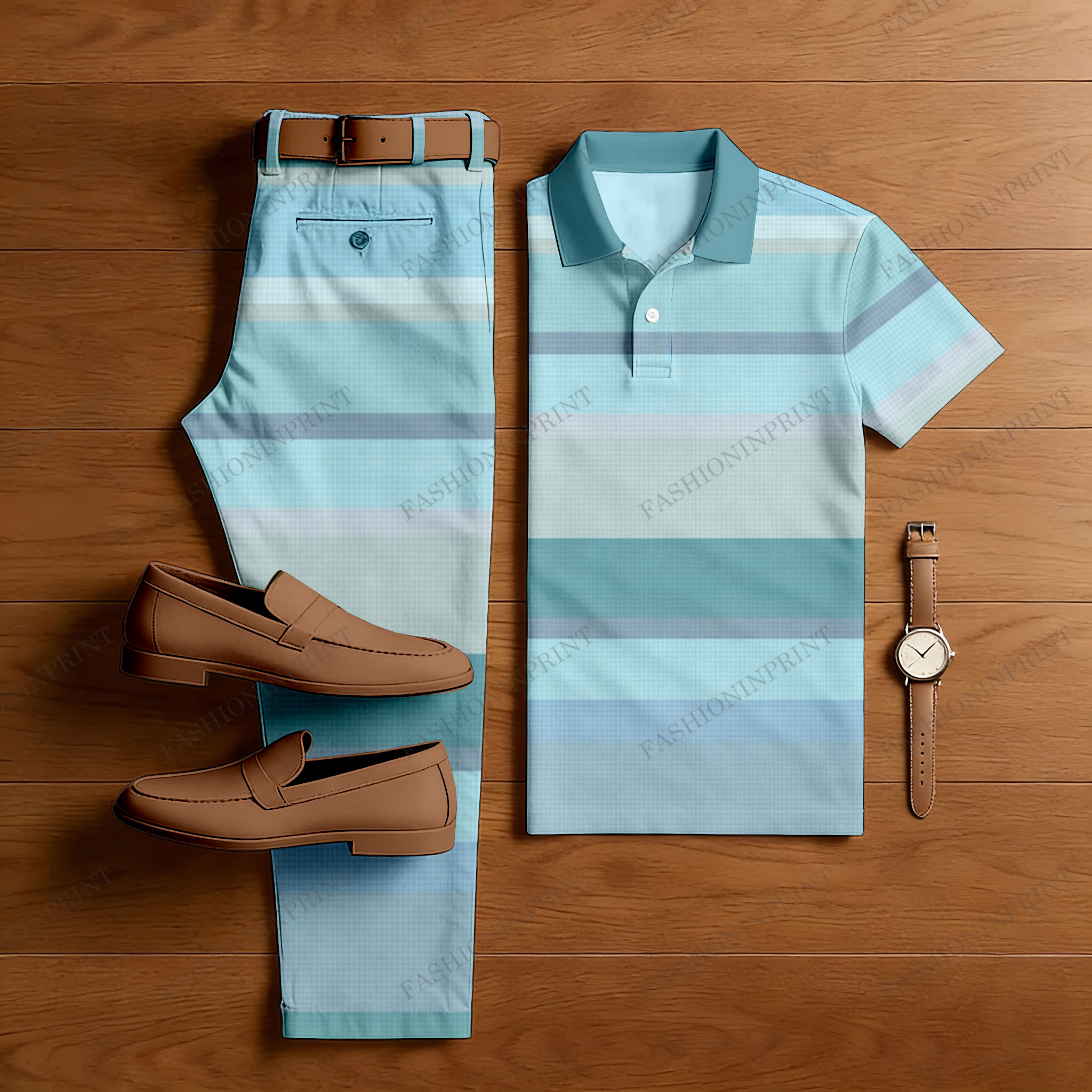 Men's Casual Blue Striped Short Sleeved Polo Shirt & Trousers Two-Piece Set