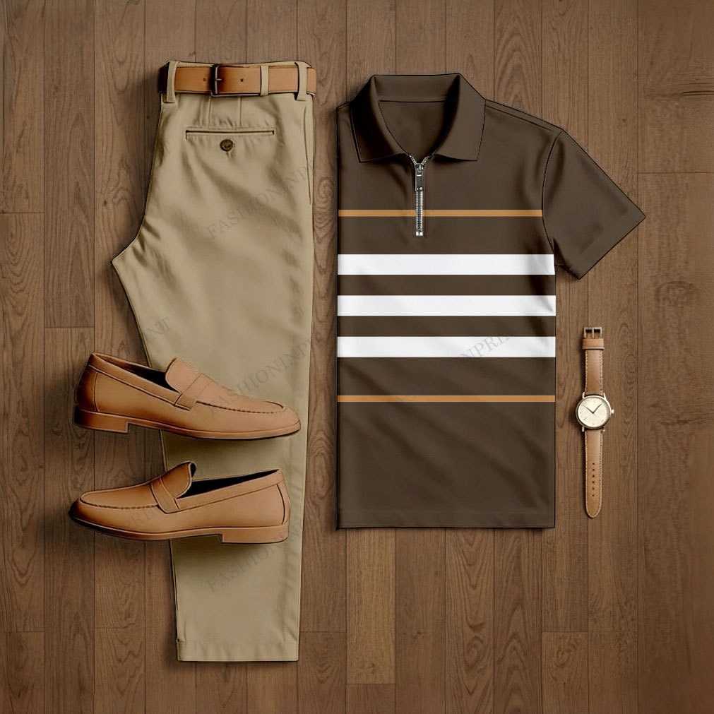 Men's Casual Coffee & Khaki Color Matching Striped Printed Short Sleeved Polo Shirt & Trousers Two-Piece Set