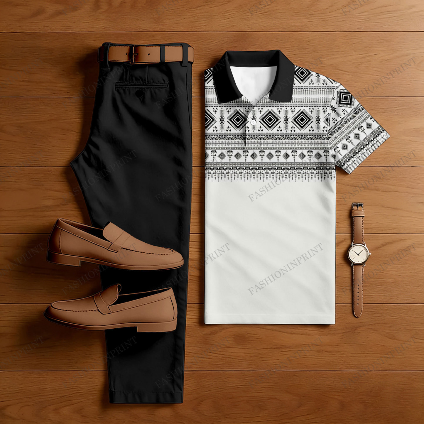 Men's Casual Color Matching Geometric Printed Short Sleeved Polo Shirt & Trousers Two-Piece Set – Mentalmens