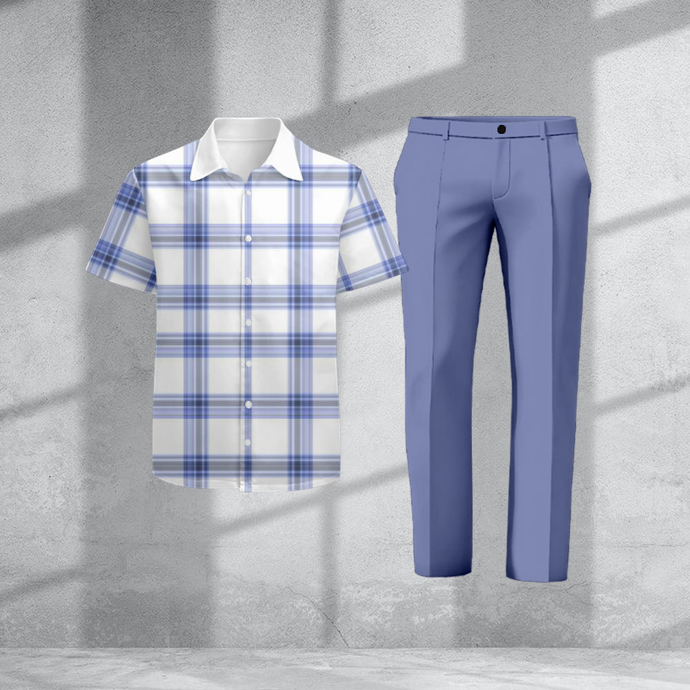Men's Casual Purple & White Color Matching Checked Print Short-Sleeve Shirt & Trousers Two-Piece Set