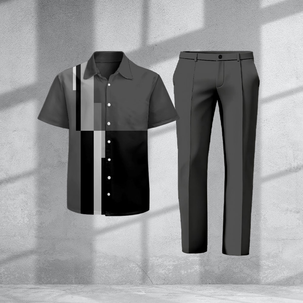 Men's Casual Black & Dark Gray Color Matching Geometric Print Short-Sleeve Shirt & Trousers Two-Piece Set
