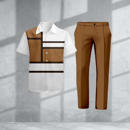 Men's Casual Brown & White Color Matching Geometric Asymmetric Print Short-Sleeve Shirt & Trousers Two-Piece Set