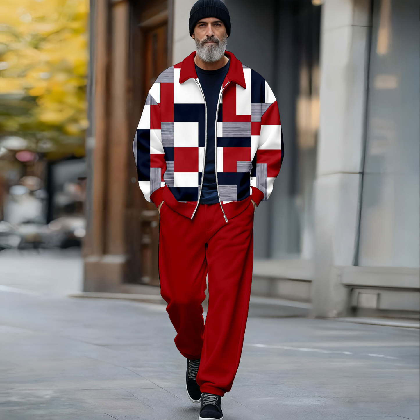 Men's Casual Color Matching Checked Printed Lapel-Collar Long-Sleeve Trousers Red Two-Piece Set
