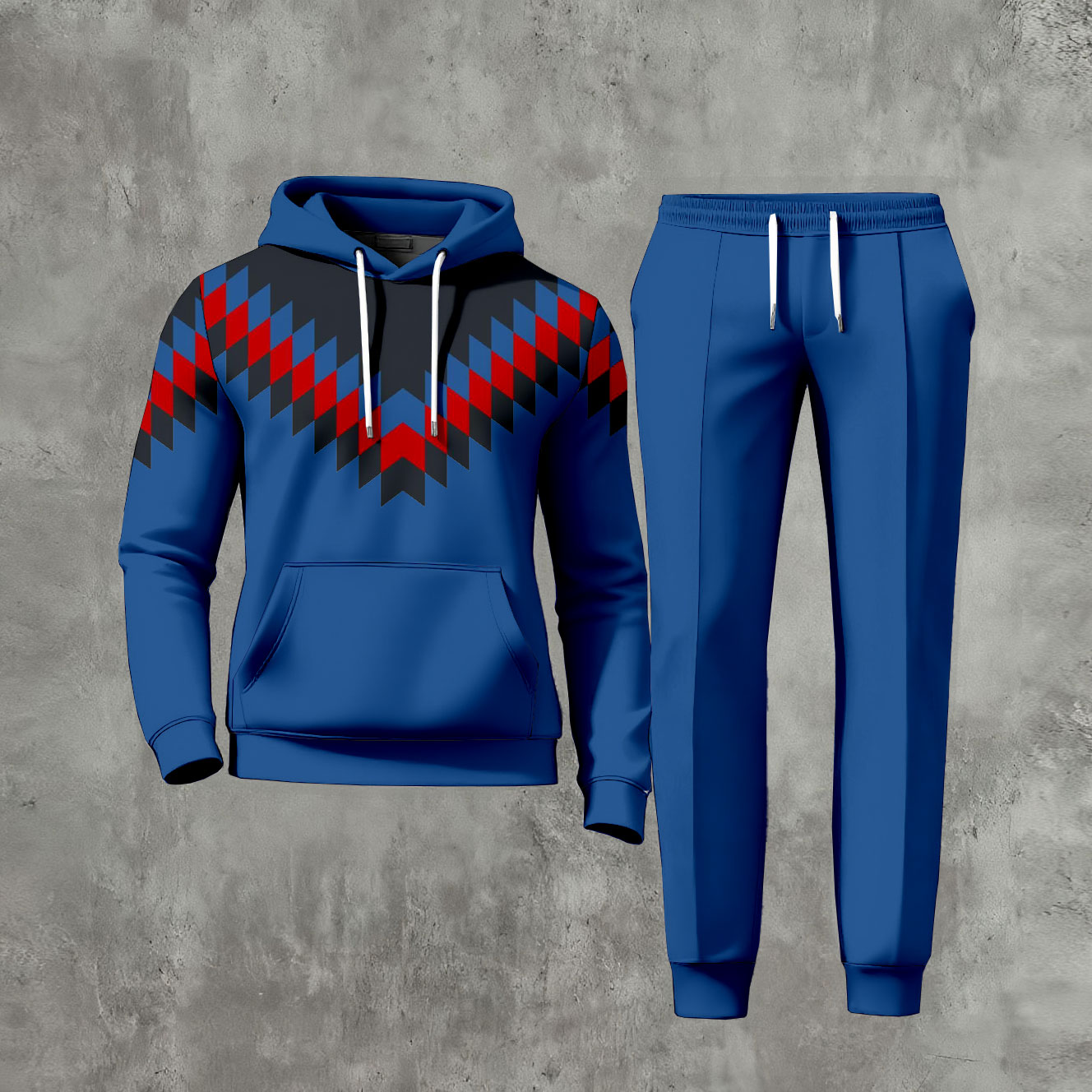 Men's Casual Color Matching Printed Long-Sleeve Hoodies Sweatshirt & Trousers Navy Two-Piece Set