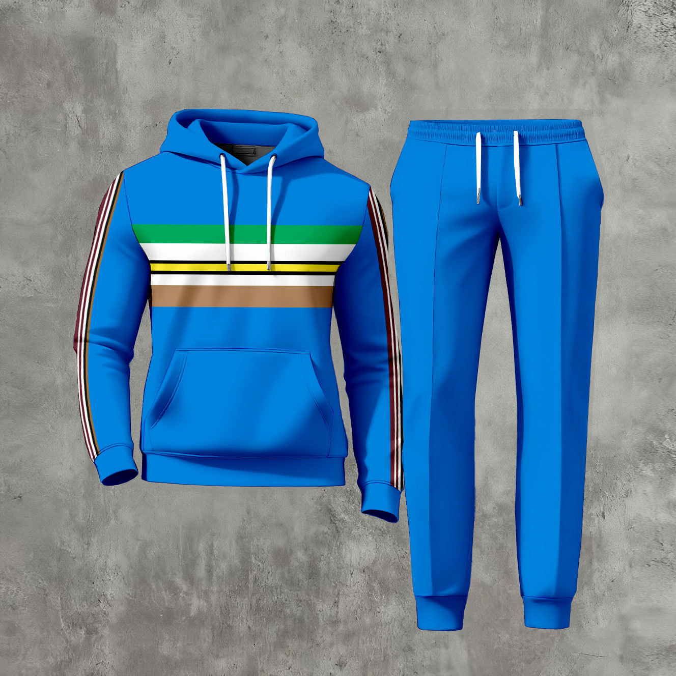 Men's Casual Color Matching Striped Printed Long-Sleeve Hoodies Sweatshirt & Trousers Royal Blue Two-Piece Set