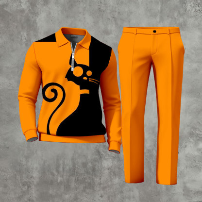 Men's Casual "Black Cat" And Orange Color Matching Printed Polo-Collar Zipper Long-Sleeve Trousers Two-Piece Set