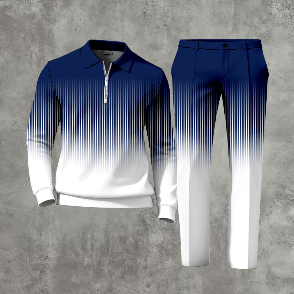 Men's Casual Navy Blue & White Gradient Striped Printed Polo-Collar Zipper Long-Sleeve Trousers Two-Piece Set