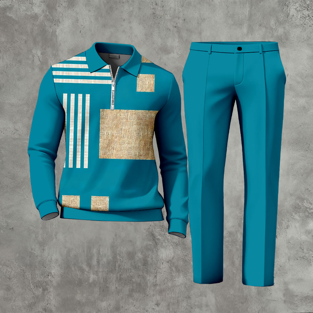 Men's Casual Blue Color Matching Geoemtric Asymmetric Printed Polo-Collar Zipper Long-Sleeve Trousers Two-Piece Set