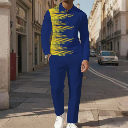 Men's Casual Color Matching Printed Polo-Collar Zipper Long Sleeved Trousers Two-Piece Set