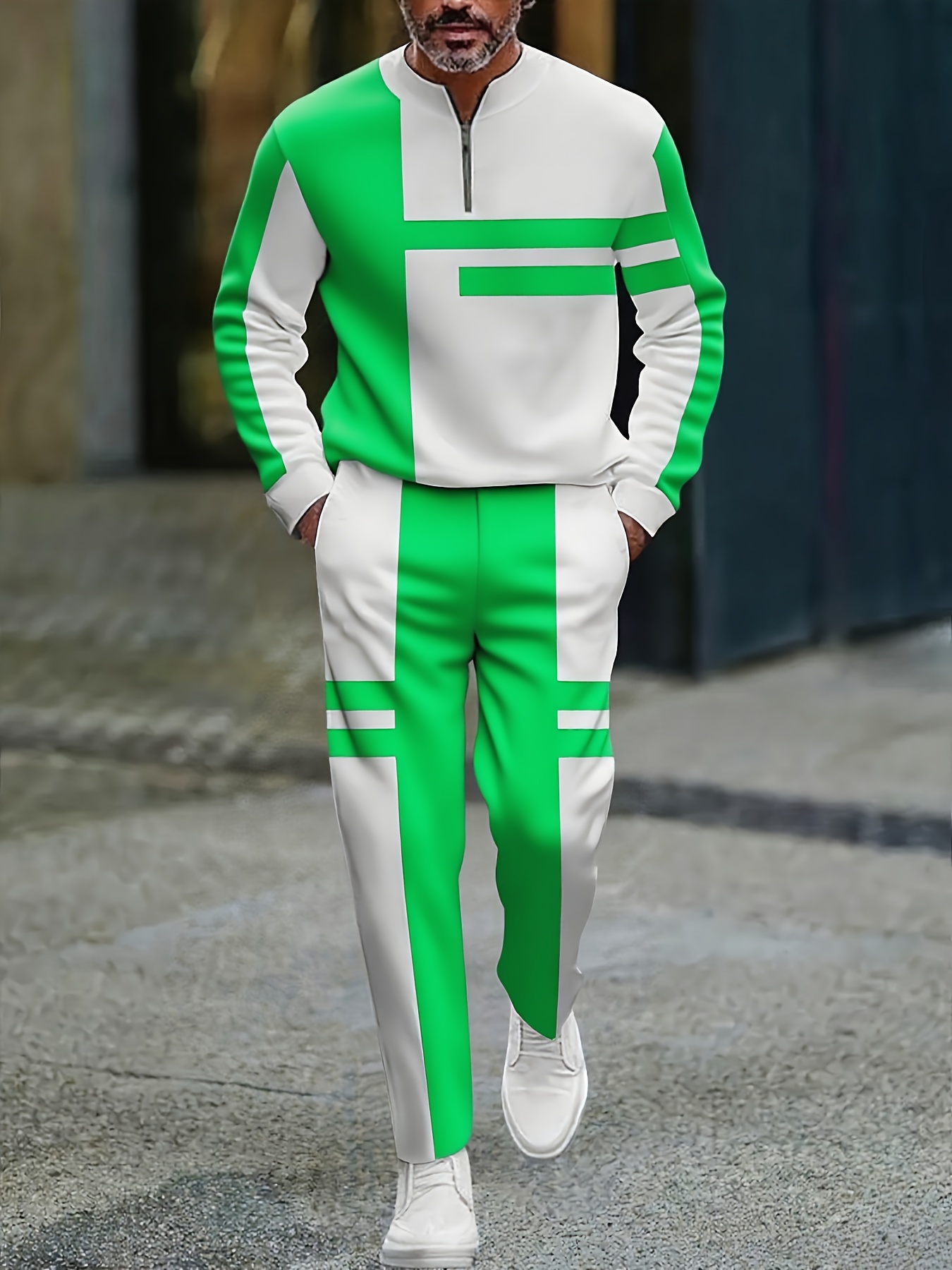 Men's Casual Green & White Color Matching Striped Printed Round-Neck Zipper Long-Sleeve Trousers Two-Piece Set