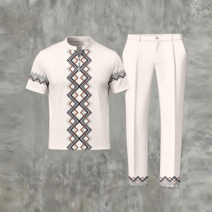 Men's Casual Ethnic Pattern Round Neck Zipper Short Sleeved T-Shirt & Trousers Beige Two-Piece Set