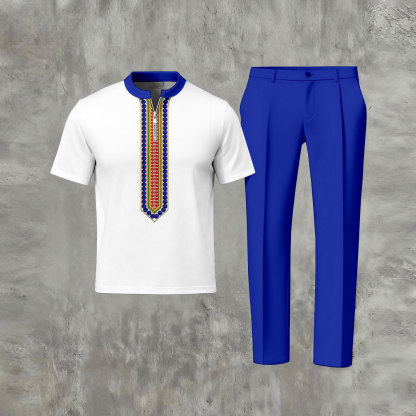 Men's Casual Royal Blue & White Color Matching Multi Ethnic Pattern Round Neck Zipper Short Sleeved T-Shirt & Trousers Two-Piece Set