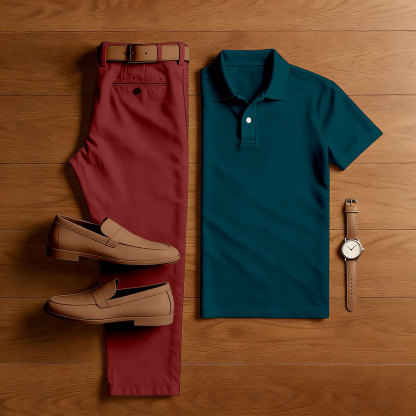 Men's Casual Red Brown & Green Contrast Color Short-Sleeve Polo Shirt & Trousers Two-Piece Set