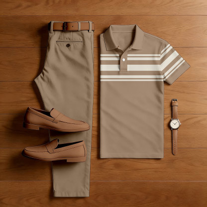 Men's Casual Khaki Color Matching Striped Printed Short-Sleeve Polo Shirt & Trousers Two-Piece Set