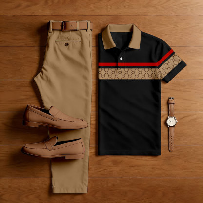 Men's Casual Tan & Black Color Matching VIntage Patchwork Printed Short-Sleeve Polo Shirt & Trousers Two-Piece Set