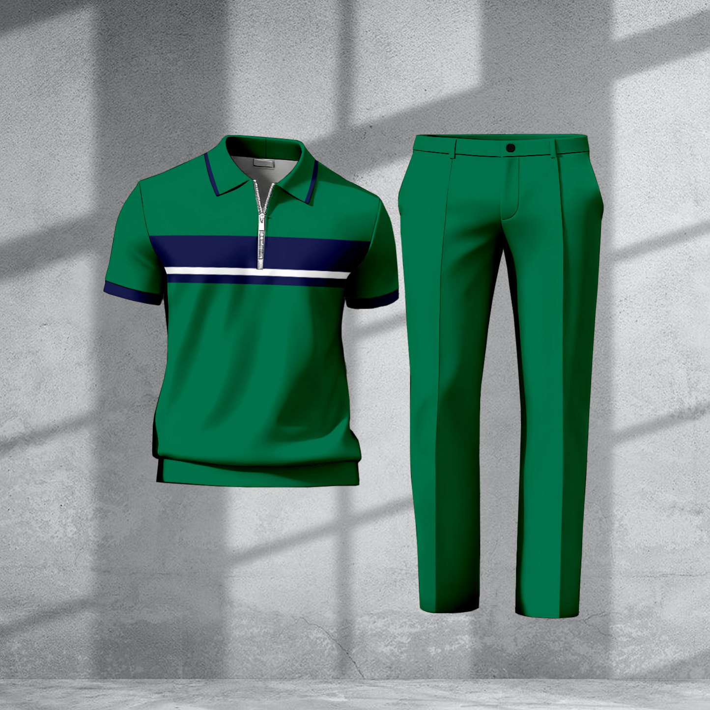 Men's Casual Green & Navy Color Matching Printed Short-Sleeve Zipper Polo Shirt & Trousers Two-Piece Set