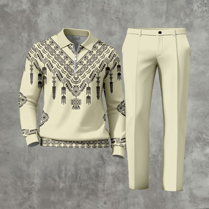 Men's Casual Ethnic Printed Zipper Long-Sleeve Polo Shirt & Trousers Beige Two-Piece Set
