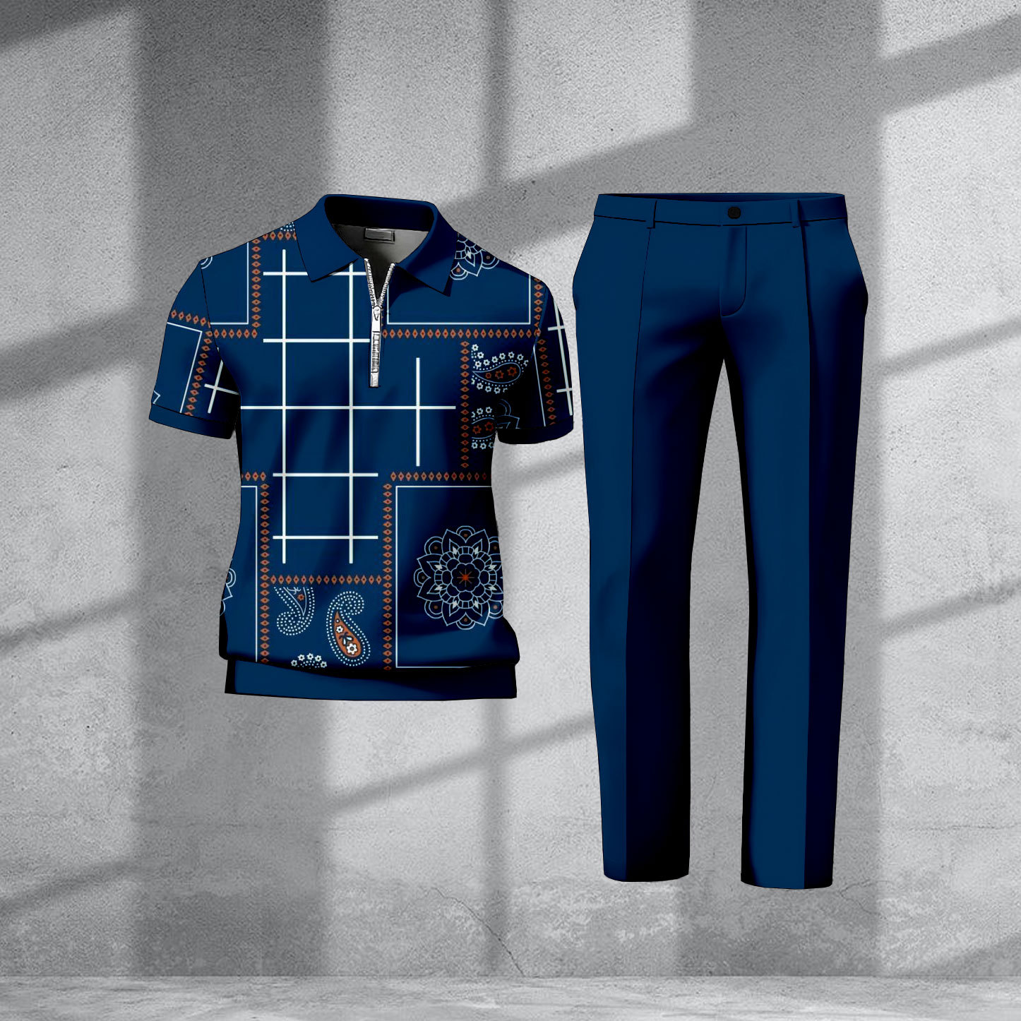 Men's Casual Navy Blue Color Matching Vintage Flower Printed Zipper Short-Sleeve Polo Shirt & Trousers Two-Piece Set