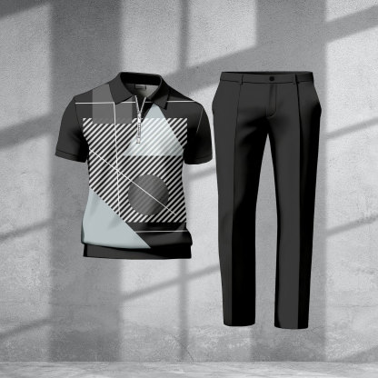 Men's Casual Dark Gray & White Color Matching Geometric Printed Zipper Short Sleeved Polo Shirt & Trousers Two-Piece Set