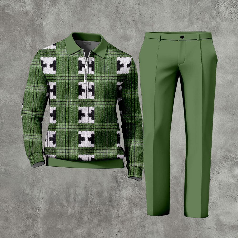 Men's Casual Green Color Matching Geometric Retro Print Polo-Collar Zipper Long-Sleeve Pants Two-Piece Set