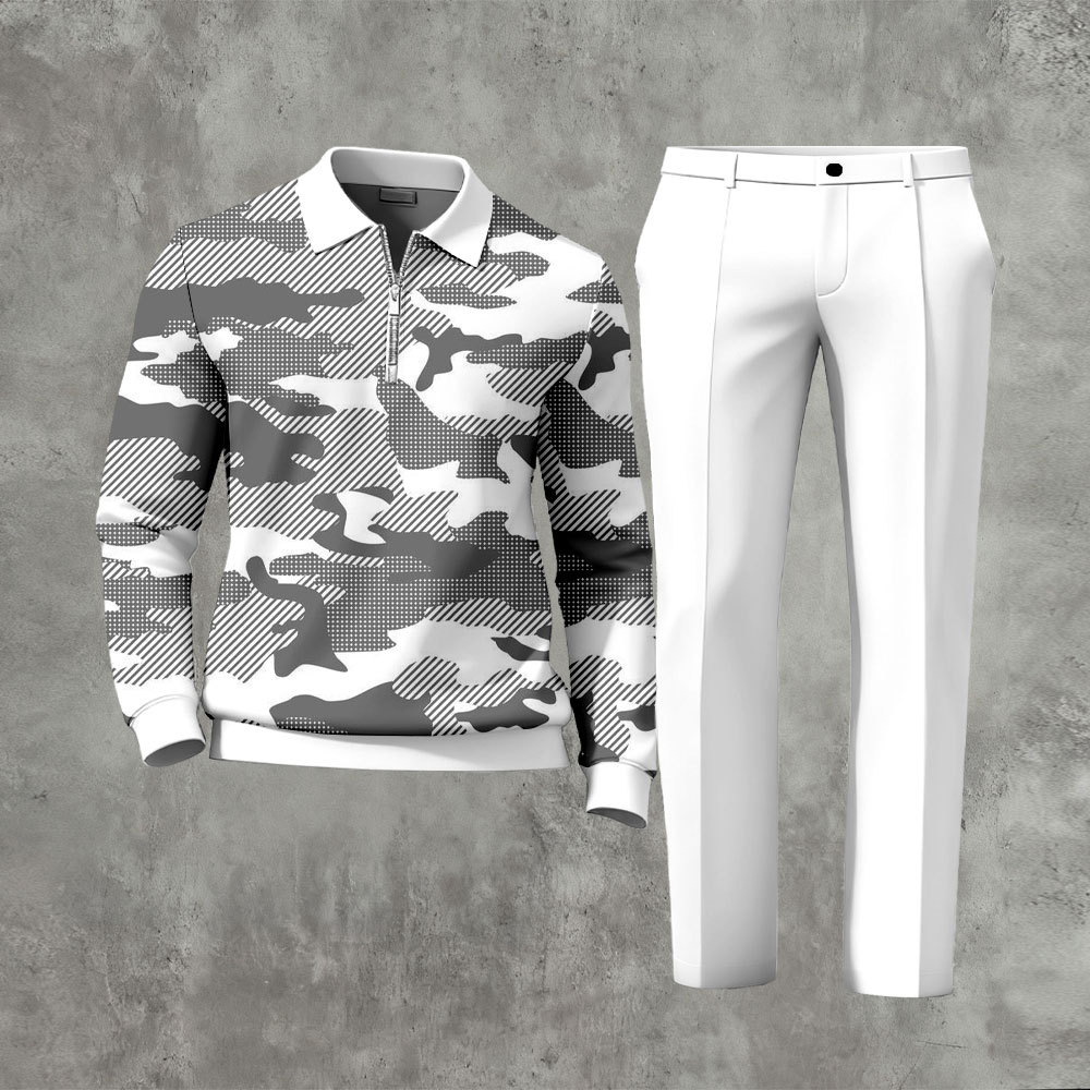 Men's Casual Gray And White Color Matching Geometric Retro Print Polo-Collar Zipper Long-Sleeve Pants Two-Piece Set