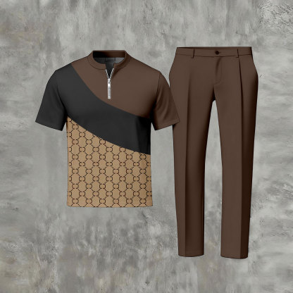 Men's Casual Brown Color Matchng Asymmetric Print Round Neck Zipper Short-Sleeve Pants Two-Piece Set