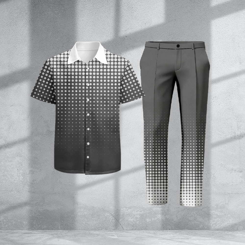 Men's Casual Gray & White Polka Dots Color Matching Gradient Print Short-Sleeve Shirt & Trousers Two-Piece Set