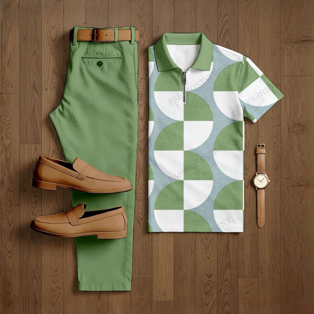 Men's Casual Green & White Color Matching Geometric Checkered Printed Short Sleeved Polo Shirt & Trousers Two-Piece Set
