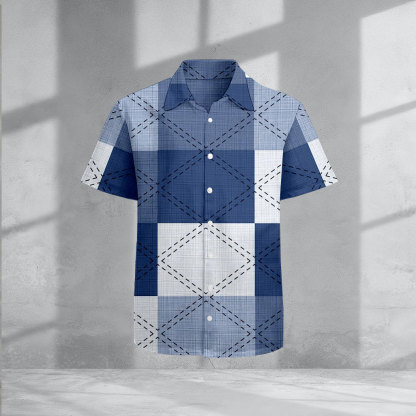 Men's Casual Lapel Denim Blue Color Matching Checked Printed Short Sle – Mentalmens