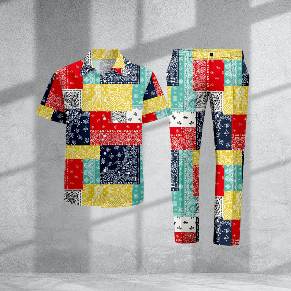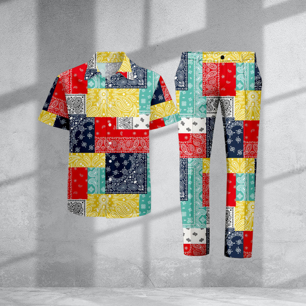 Men's Casual Multi Color Matching Paisley Print Short-Sleeve Shirt & Trousers Two-Piece Set