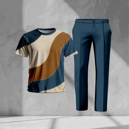 Men's Casual Navy Blue & Khaki Color Matching Printed Short-Sleeve T-Shirt & Trousers Two-Piece Set