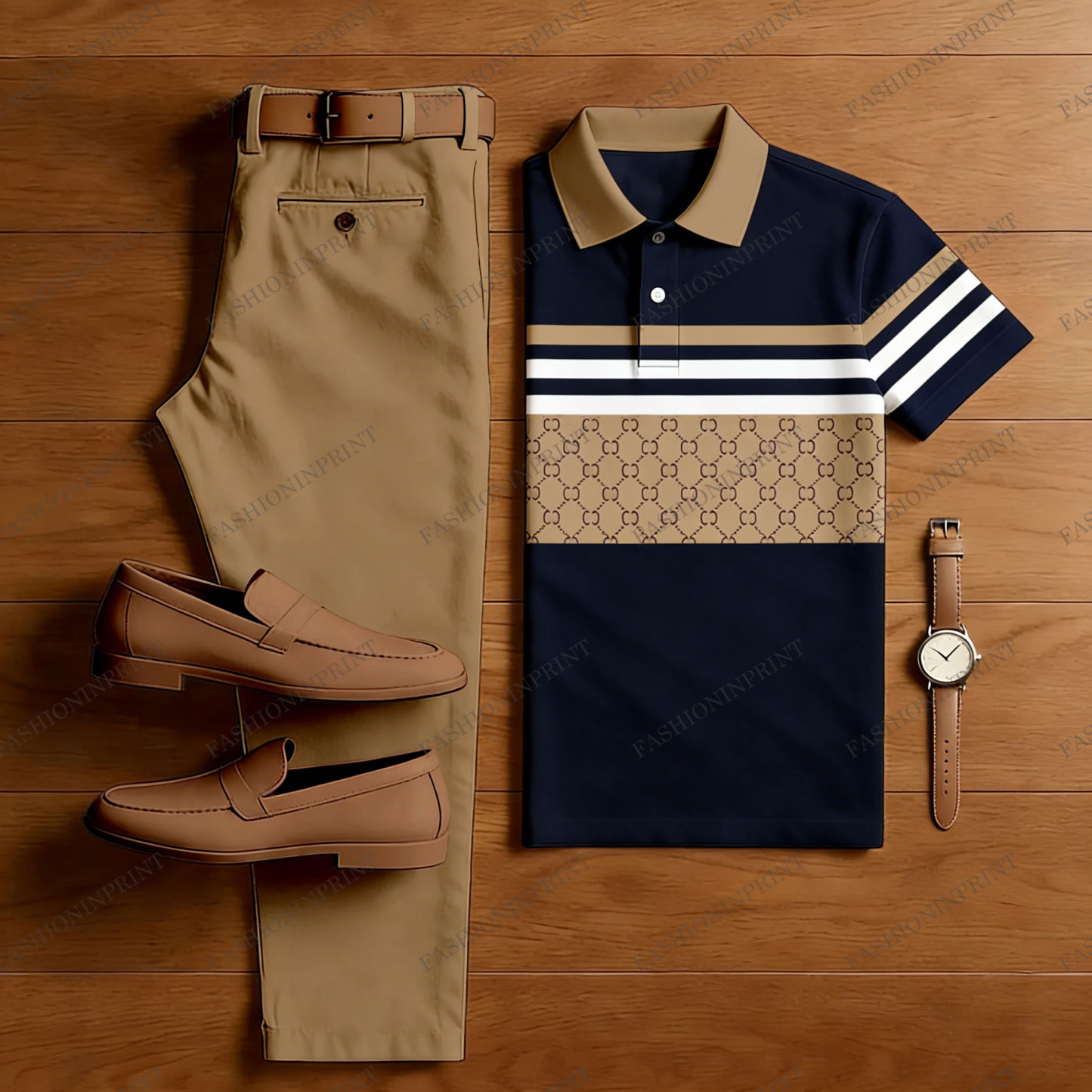 Men's Casual Navy Blue & Tan Color Matching Retro Style Patchwork Printed Short Sleeved Polo Shirt & Trousers Two-Piece Set