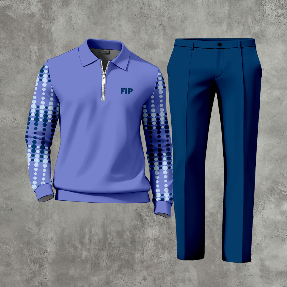 Men's Casual Purple & Royal Blue Color Matching Polka Dots Printed Polo-Collar Zipper Long-Sleeve Trousers Two-Piece Set