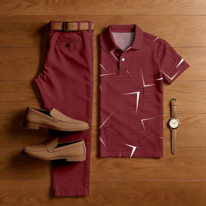 Men's Casual Red Color Matching Checkered Printed Short-Sleeve Polo Shirt & Trousers Two-Piece Set