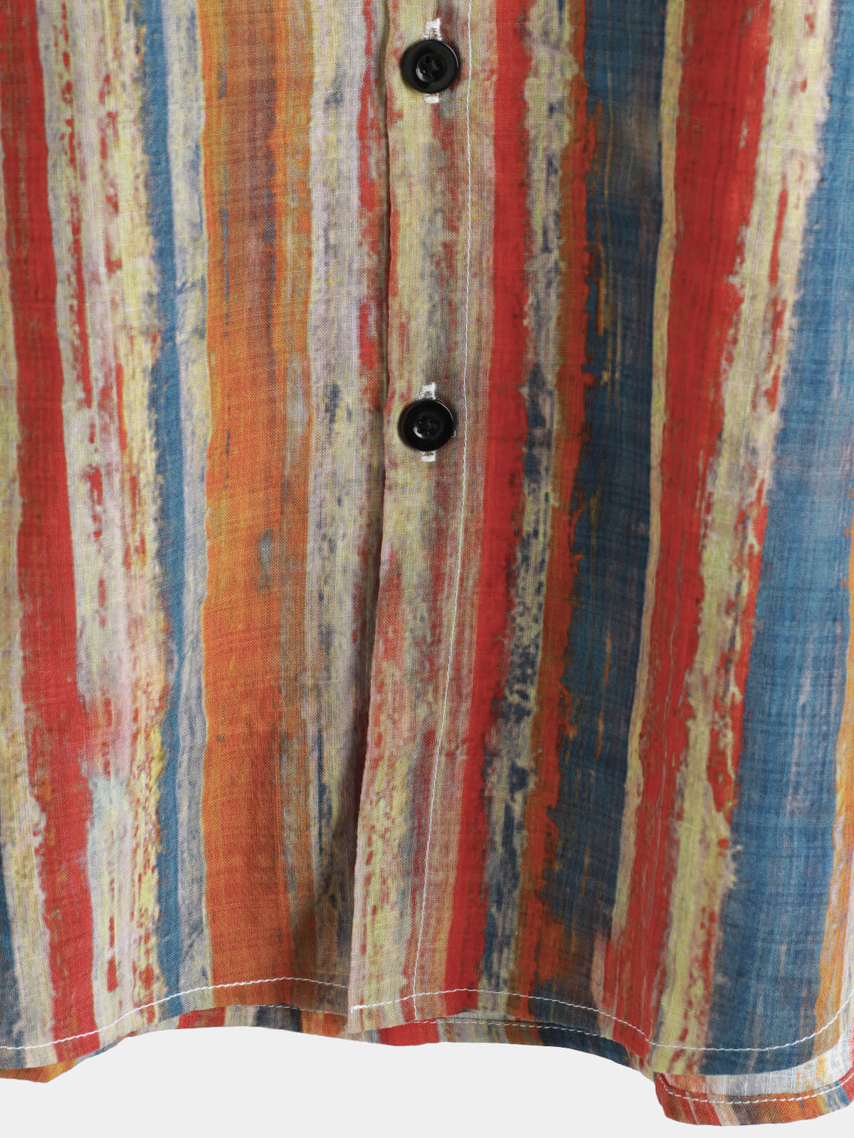Men's Casual Retro Multicolor Striped Holiday Button Up Short Sleeve Shirt