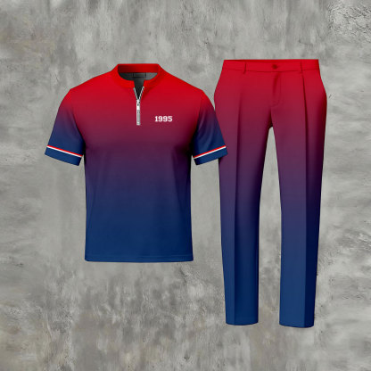 Men's Casual Royal Blue & Red Color Matching Gradient Printed Round Neck Zipper Short Sleeved T-Shirt & Trousers Two-Piece Set
